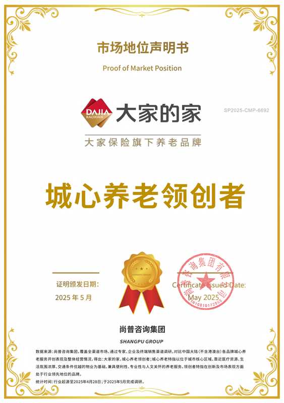 近日,尚普咨询集团发布独立调研报告,认证大家保险旗下专业养老品牌“大家的家”为“城心养老领创者”。该认证基于对模式开创性、服务创新性及行业影响力的综合评估。这也是中国养老行业首次由权威第三方认证标杆品牌。